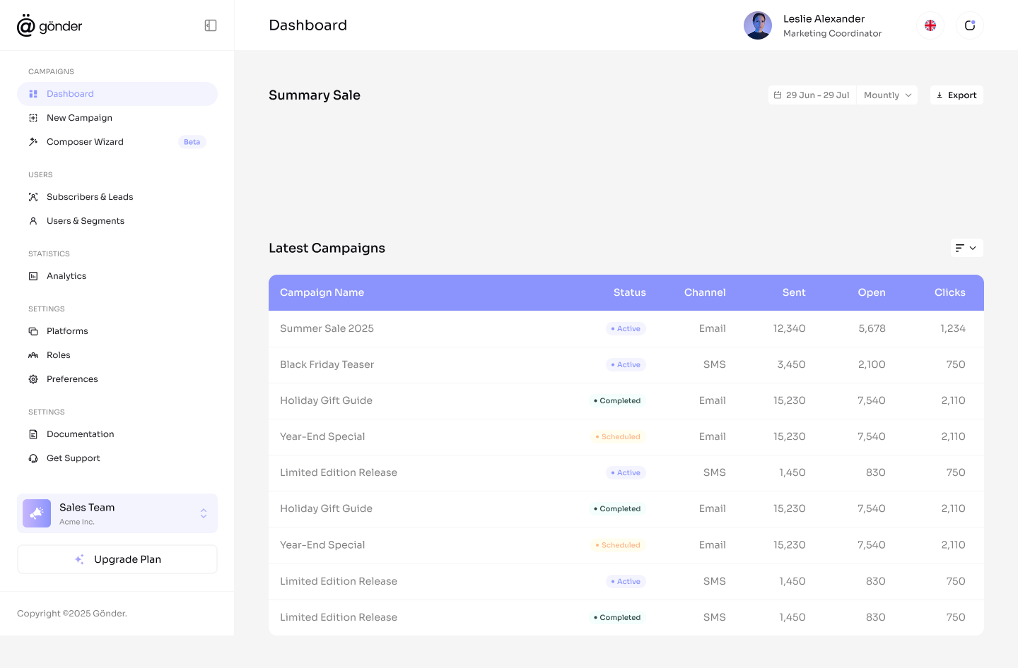 Gönderisapowerfulmarketingplatformthatstreamlinesmulti-channelcommunicationandnotifications,poweredbyAIanddeepanalyticsforunmatchedsuccess.